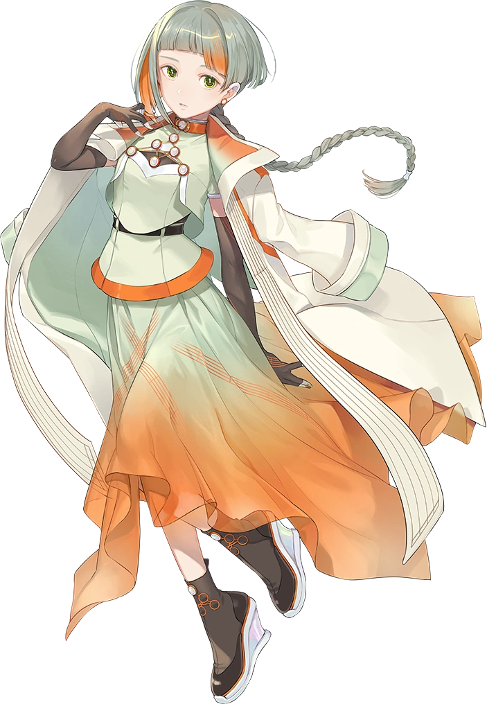 Chis-A has short angular choppy grey bangs with orange tips and a long thin braid. Her eyes are emerald green. Her shirt is lime green with an orange hem and neckline. White buttons adorn the neck. A thin black belt is tied around her waist. Her skirt is long and flowy, the color being a little green at the top that gradually fades into a deep orange color at the hem. Her gloves are long black opera style fingerless gloves. Her fingernails are painted a pale orange. On her feet are black and orange white-soled platform shoes. Over her outfit she wears a long lime green coat with an orange hue on the collar.