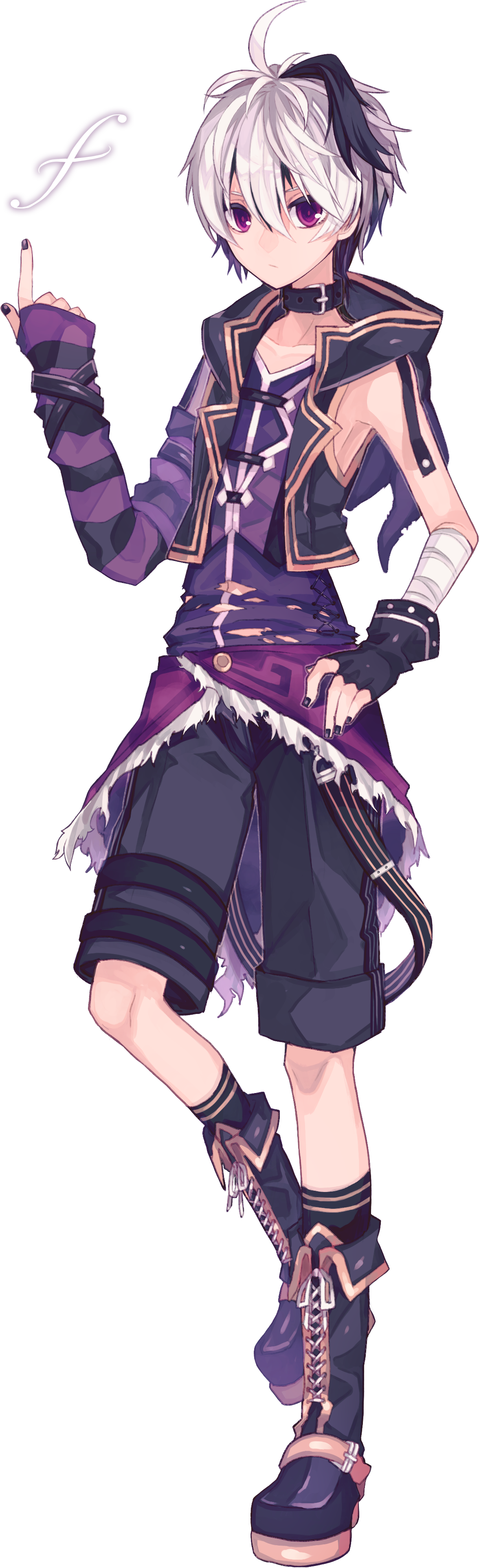 In her CeVIO AI boxart, flower has light blue eyes and choppy, white, shoulder length hair with orangey-pink tips. Two thicker strands are dark purple. The tips of her hair curl around chunky, violet, strapless headphones. She wears a white V-neck crop top over a partially see-through grayish-purple tank top. Over her shirt, she wears a heavy black coat with her stylized ‘C’ logo printed on the shoulder in gold. The inside of her coat is light purple. Her shorts are black with vertical burnt orange stripes, held fast by a clear belt with orange belt buckle. On her feet are large grey and midnight purple hightop tennis shoes, with orange laces over purple and orange knee-high socks. Her long fingernails are painted a soft lavender color.