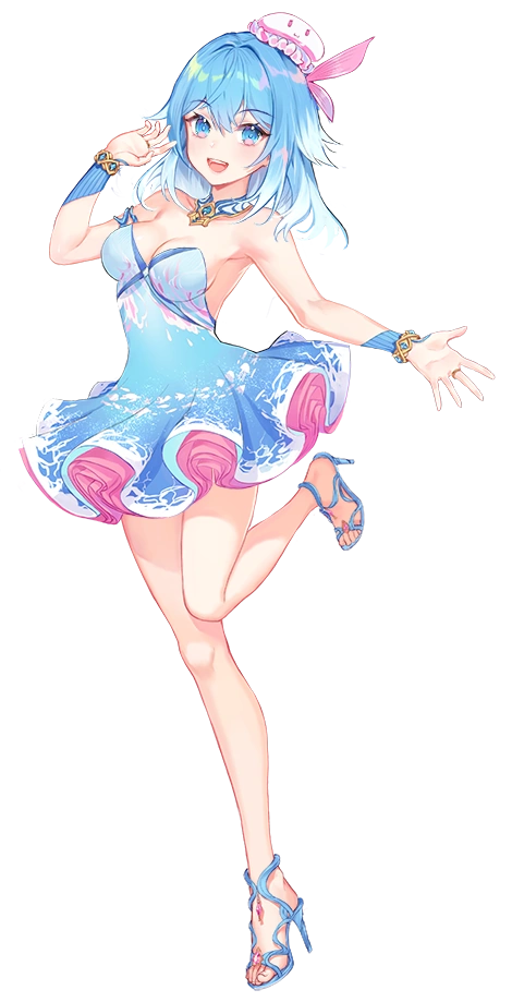 Haiyi’s design follows an ocean theme. Her color scheme consists of light and dark blues, whites, and pinks. She wears a jellyfish on the left side of her head.