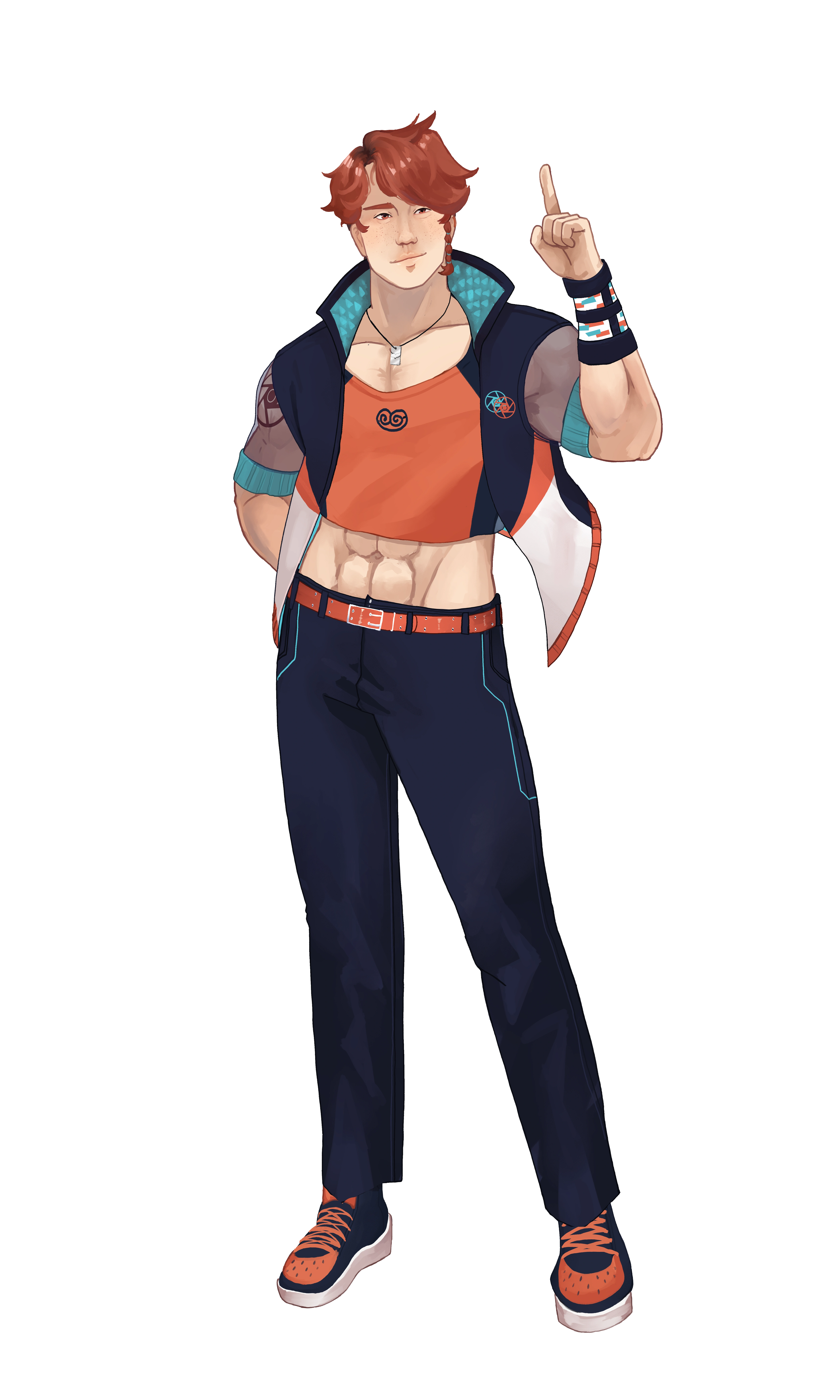 - Outfit - An opened dark blue and white jacket with a light blue collar and orange details, on top of a black compression turtlenecked crop-top with a front zipper,