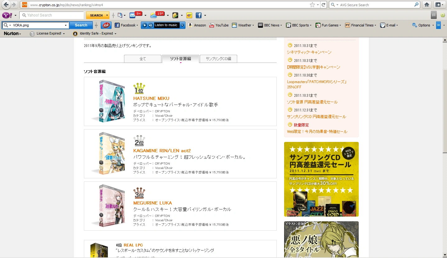 Crypton's product list, 12/10/2011, Megurine Luka is in 3rd place