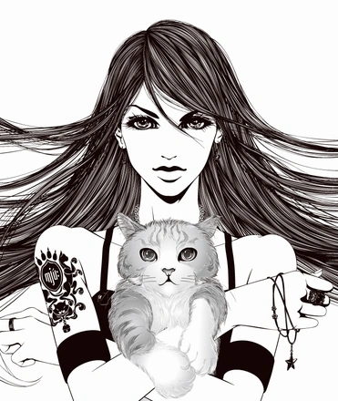 Mew is depicted in an aesthetic monochrome style. As her name suggests, her design is cat-themed.