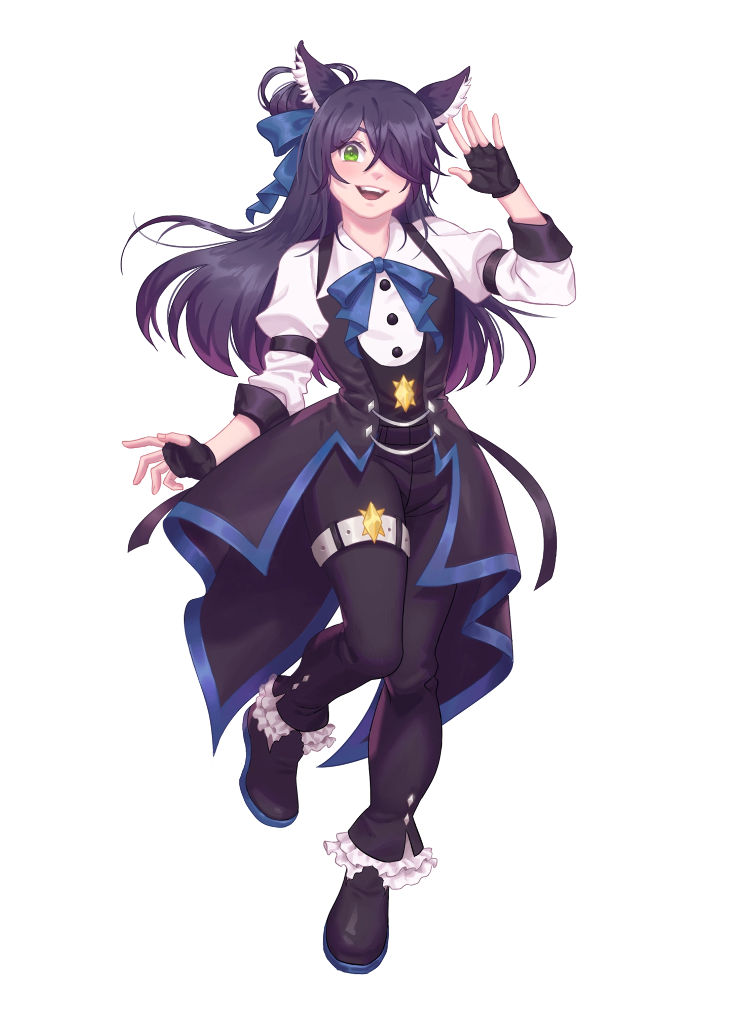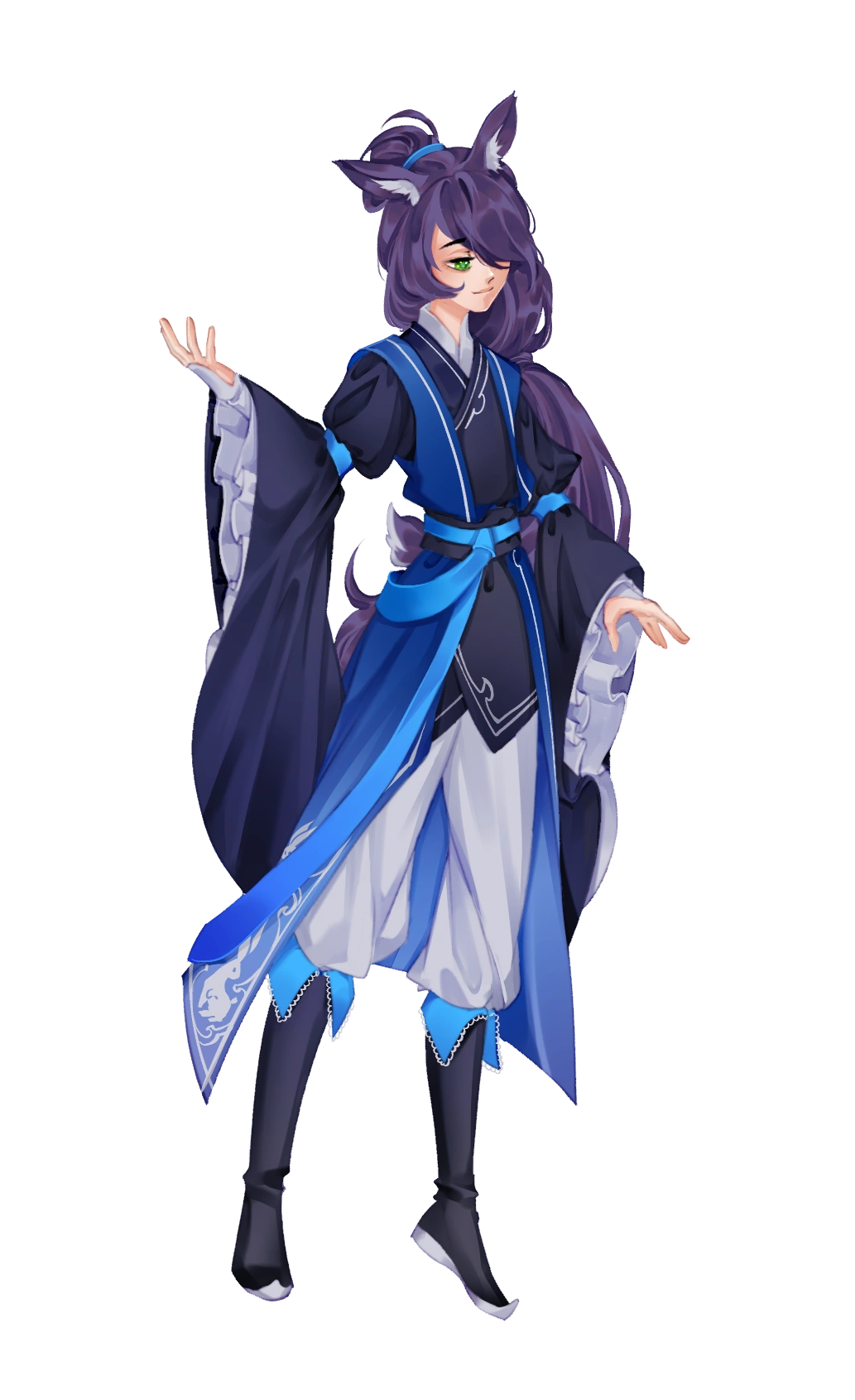 Miyo is a rabbit yao with long indigo hair and bright green eyes. Their bangs cover the left side of their face, including their eye. The left of their face is open for interpretation. They have rabbit ears and a tail. Their color scheme usually consists of black, blue, and white.