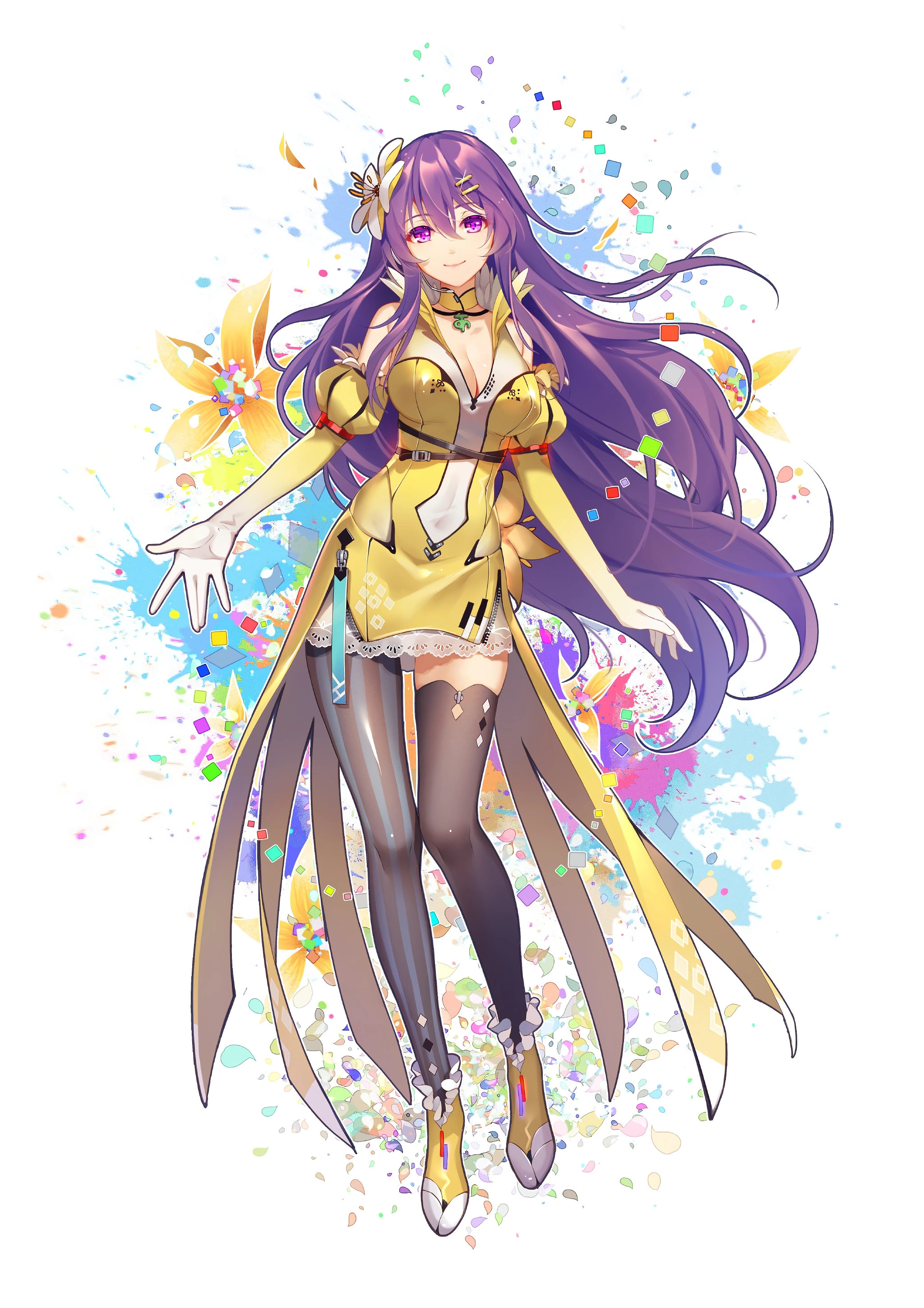 Qingxian's V4 illustration was drawn by TID and followed a more regal theme, likely in reference to her first original and demo song "Ace". The dress became longer in the back and split into two sections, the tails of the dress reaching her feet. On the back side of her left hip, there is a large flower that is the same type as the one found in her hair. The front of her dress has a cut down to her stomach and she wears a white slip underneath. The v-cut at the front of her dress is lined with flower petals. She received two black belts around her torso rather than one around her hips. The Devanagari was still located on her neck but became green instead of purple. Her gloves' tops became puffy and had flower petals at the opening. Her long socks were asymmetrical: the right sock covered her whole leg and has blue stripes running down, while the left sock was 3/4 up her thigh and had diamond designs at the top. Her heeled ankle boots have flowers lining the top and the wings were removed. In her hair, she has two yellow clips on her bangs rather than one.