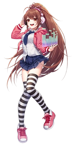 RIA's illustration is based off of the original VTuber RIA design retaining many of the same details namely RIA's long brown hair tied into a ponytail, her signature pink jacket and black and white striped leggings.