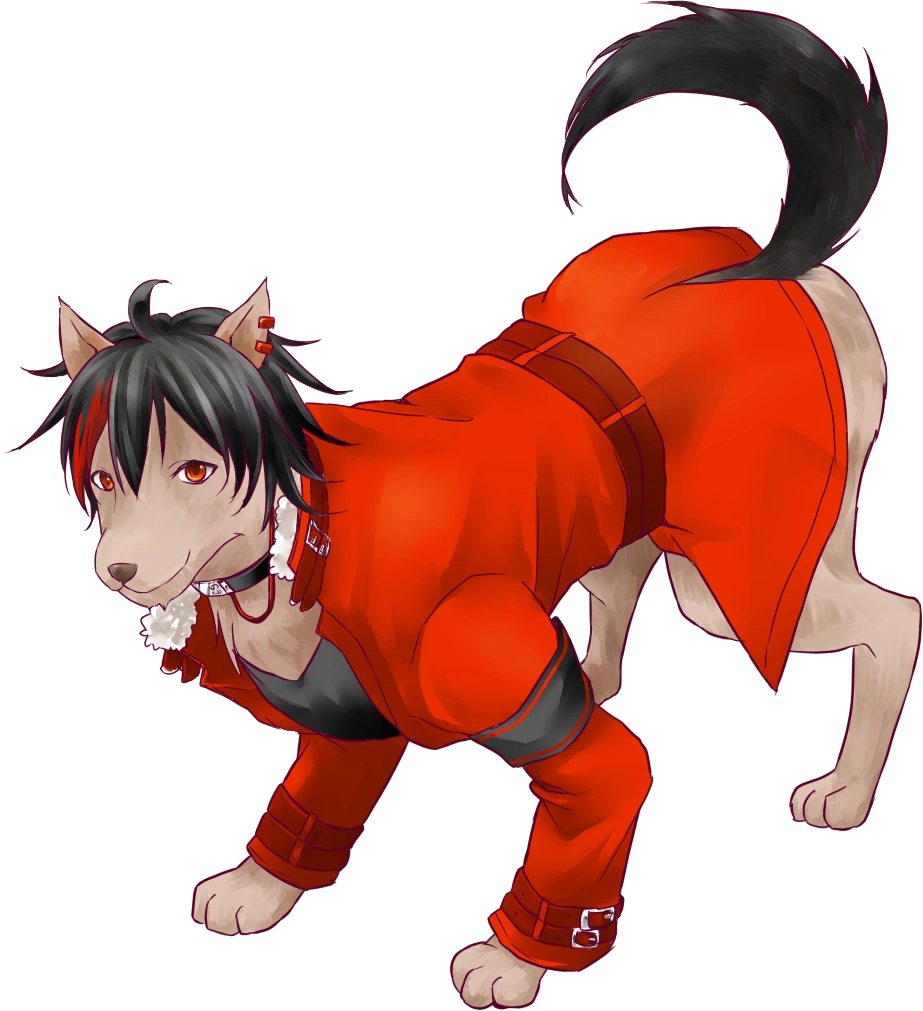 Underneath he wears a black cropped tight V-neck that shows off his abdominal muscles; the shirt can either be sleeveless or have sleeves that reaches half-way down his biceps. He also has a black armband with red trimmings and his logo, a diamond checkerboard with a black rook chess piece in the middle, around his left arm. He wears black pants that have dog collars at the end of each pant hole similar to his coat accompanied with a red belt. Said red belt has a silver metal buckle with a cross cut out. For easier wearing when in dog form, the belt around the pants and around the waist of the coat are velcro.[2]