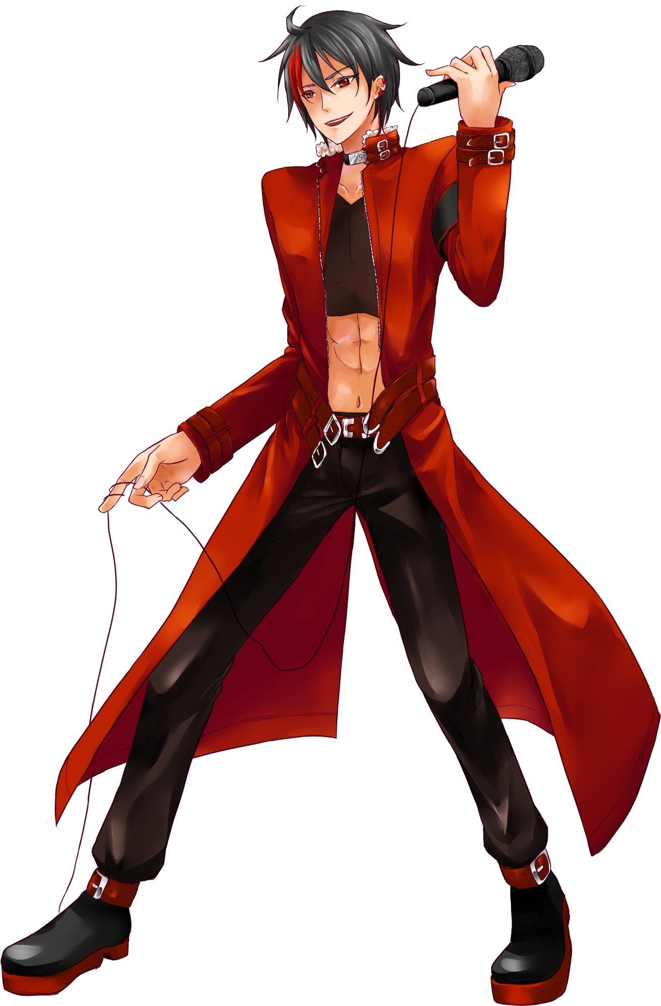He also wears black heeled boots with a red sole. Because of his insecurity over being shorter than Ruko, the height of his boots are adjustable to make him taller depending on who he sings next to.[2]