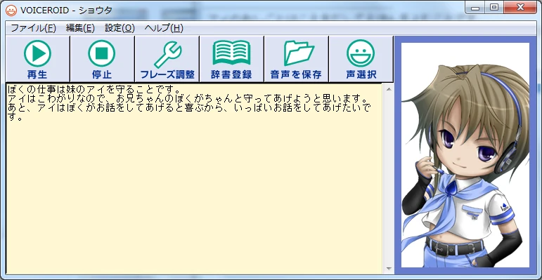 The user is able to adjust the tempo, pitch, and intonation to make the program sound more natural. VOICEROID enables the user to type in any word or phrase and Shouta and Ai Tsukuyomi will repeat it back to them. [2] All VOICEROID products will be packaged with the animating software, Crazy Talk SE.[3]